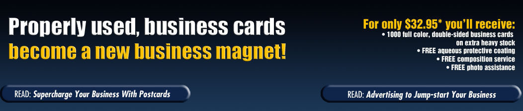 We've all seen the ads for "free business cards." Some of us have even attempted to access this too-good-to-be-true offer. If we weren't put off by the need to accept on of the printers predetermined formats, we were probably appalled by the flimsy weight of the stock when we received our "free gift." Naturally, no one wants to look like they can't afford good substantial business cards. That would be a truly false economy. Still other printers are touting 16-point cover stock cards. That gives your prospects the opposite impression. It just looks like you are trying too hard. Sixteen point cards have a further drawback. They are so thick you can only get five or six in a standard card case. Forget about putting them into one of those vinyl business card files. |